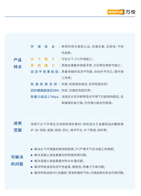 环保安全获得饮用水级别认证,无毒无害,无异味,不损伤皮肤;水下施工:可在水下、0°C环境施工;带锈施工:简易处理基材表面浮锈、沙石等杂质即可施工;自 流 平 效 果 极 佳:具备卓越的自流平性能,自动补平凹凸,提升施工效率;防腐防锈优异:防锈、抗腐蚀性极佳。